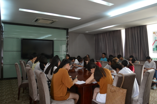图为:会议正在进行 会议开始,米娜老师对团委学生会本学期各项工作进行总结,并表达了对本学期工作的肯定,以及对团委学生会干事们的希冀和鼓励。紧接着,由各部门的部长助理汇报上周的工作情况和部门活动。临近期末,各部门的工作也相对减少。汇报结束,米娜老师指出了本学期工作中存在的一些问题和不足,她强调,各部门之间要增强沟通和交流,随时了解,及时反馈,做好带头作用。最后,周婷说道,微信在暑期要照常运行,也希望学生干部们能够仔细浏览我分院的微信内容,了解情况。