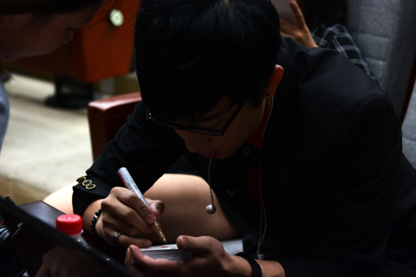 图为:魔术师薛骅在为大家签名留念 紧接着,由薛骅上台演讲和表演。首先,通过一段VCR,大家对魔术师薛骅进行了初步了解。随后,围绕本次讲座的主题“七彩的天空”以及90后的特点,薛骅建议大家要生活充满信心,并告诉同学们“什么是开心”,要定位自己的位置,选择适合自己的爱好,“梦想需要靠自己追逐,不要顾前想后,因为优柔懦弱的性格会带来烦恼与痛苦”。随后,薛骅用一副扑克牌进行Magic现场教学,与现场的同学互动,将现场的气氛推向了高潮。教学结束后,薛骅告诉同学们“Never give up,谋事在人,成事在天”,要热爱自己学校的一切,怀着感恩的心,并向大家分享了如何提升自己的人际关系和魅力,随后再一次进行现场了魔术教学。在提问环节,薛骅也表露了大学时期以及平时对魔术经验的积累,正是这些经验让他在央视的舞台上并没有紧张。