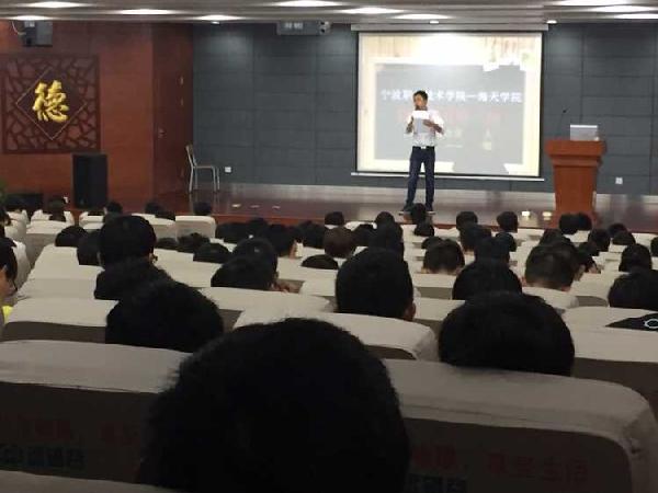 王烈辉学长曾获得宁波市“首席工人”荣誉称号,在荣誉光环下的他是一副朴素踏实的形象。首先,王烈辉学长以千里马的故事引出道理,教育新生做事情量力而行,切忌好高骛远,同时,王学长以自身经历提醒海天学院的学子注重发现身边细节,锻炼胆量以及把握人际关系。
