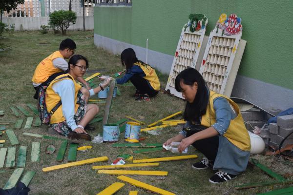 本次活动主要是帮助幼儿园做一些日常工作,教导幼儿园孩子更好的学习,走入他们的生活,了解孩子们的世界。活动开始,志愿部部长助理张梁将志愿者们分成了4个小组,并且分配给他们不同的任务,有教孩子画画的、交孩子堆沙的、有教孩子叠被子的、有的在帮助幼儿园粉刷木块的。
