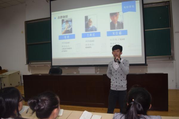 2015年10月14日下午6点20分,为电信学院学生会新成员对学生会能有更深入的了解,融入并适应学生会的工作。电信学院新干事见面会在精技楼503教室举行。团委书记陈宇老师、主席团成员以及15个部门部长助理及干事参加本次会议,本次会议由主席团助理谢柏通主持。
