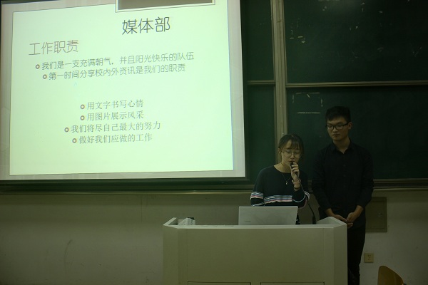 接着新干事们讲述了其对团委学生会的了解和对其今后发展的想法,其中反复强调的便是交流、团结、坚持。时间飞逝,会议在吴艳艳老师的总结发言中结束。她用代表者、服务者、引领者诠释了团委学生会的服务和奉献精神,并且寄语新干事们望他们在这个舞台上展示各自的风采。