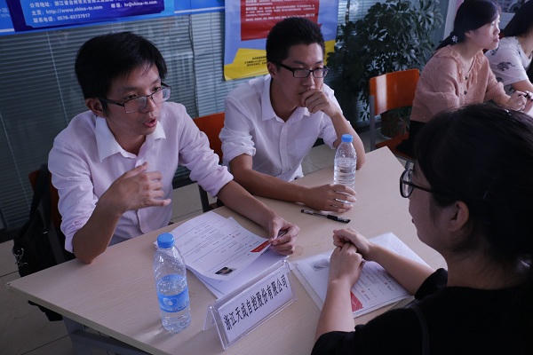 图为:应届毕业生与企业人员进行交流