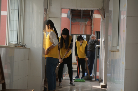在对福利院的布局有了大致的了解之后,带队队长便迅速地布置了任务,开始了打扫活动。身穿黄色马甲的他们,扫地、拖地、擦窗个个干得热火朝天,明晃晃的身影就像一道道亮丽的风景线,为福利院增添了一丝朝气。遇到爷爷奶奶他们会甜甜地叫一声,使得老人笑得眼睛眯成缝,连连称赞志愿者的能干。