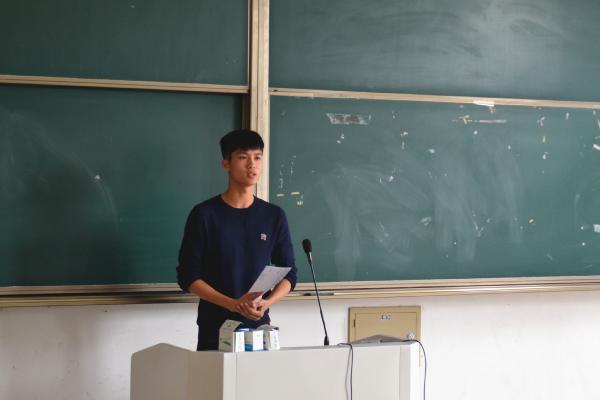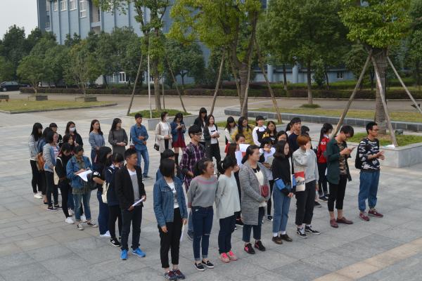 图为:王安时正在讲解注意事项 会议过半,魏雷老师带领志愿者团队在图书馆前进行模拟实练,从人员分配到列队演练,在此过程中每一位志愿者都配合得十分默契。