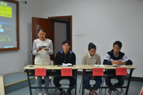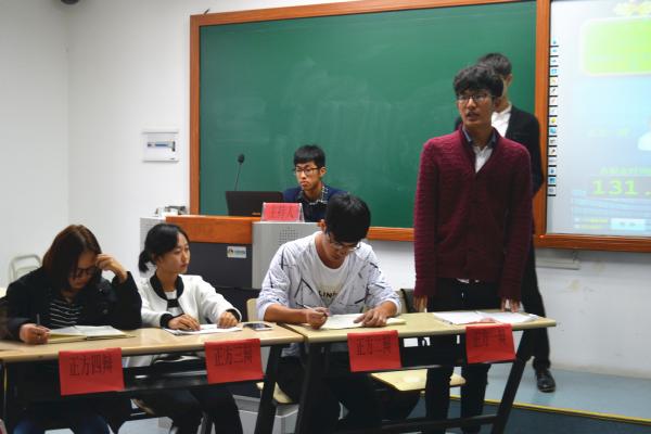 图为:正方辩手正在辩论  图为:反方辩手正在陈词 双方选手在开场陈词,攻辩,攻辩小结等各个阶段中,思路清晰,结合历史妙语连珠,使现场的辩论氛围急速升温,也时常引得在场同学阵阵发笑。在而后的自由辩论环节,双方选手对自己的观点进行了更深意义上的解读,你问我答舌灿莲花,双方优秀的口才一次次的把比赛气氛推向高潮。赛后,陈逸凡对此次辩论进行了详细的点评。他充分肯定了双方选手在辩论时的活跃表现,同时也提出了不足之处。最终,月贝凡队获得了最后的胜利。在另一赛场,同样反方辩手获得胜利。