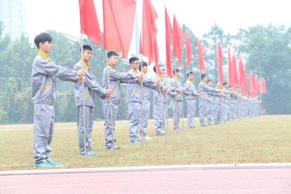 在走过主席台后,红旗方队跑步分散入场,队列快中有序、整齐划一,在指定位置站好后,队员们等待开幕式的开启。灰色的工作服与红旗互相衬托,在操场上形成一道特殊的风景线。