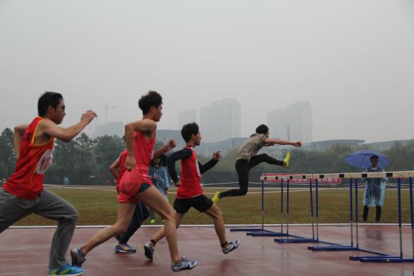 2015年11月4日下午13:30在东校区田径场举行了男子110米栏总决赛。虽然天空灰暗,阴雨绵绵,但观众席上的人群却是激动澎湃,呐喊助威声此起彼伏。运动员也时刻准备着,做着赛前的热身运动。