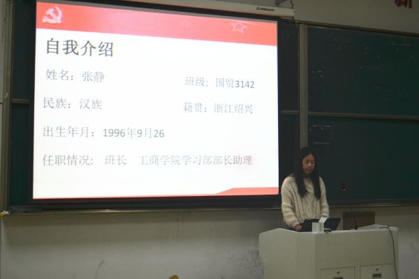 为更加积极响应党的号召,工商学院于2015年11月12日晚5点45分,在明德楼103教室开展工商学院发对象阳光汇报会,汇报人为此次的22名发展对象。 会议伊始,杨超老师对本次会议进行简单介绍。汇报会正式开始,第一位是来自国贸3132的陈英,她从学习、工作、生活、思想和个人五个方面进行汇报,大三的她已经参加各类活动,并获得各类奖项,她希望自已能够成为一名预备党员。接下来的发展对象都是从学习、工作、生活、思想和个人来汇报的。第五位来自国贸3141宓叶露,她除了从以上5个方面进行汇报,更详细展现了自已的收获与不足、计划安排等,她说,会努力向党组织靠近,严格要求自已关注时事政事,真正做到好,很好,越来越好。