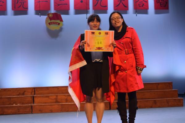 随后,来自各班的12支代表队以整洁华美的服装、高亢嘹亮的歌声、蓬勃向上的朝气亮相比赛现场,轮番展示了他们精心编排的合唱曲目,联袂为观众们带来了一场精彩的视听盛宴。饱含真情的《爱我中华》、雄浑激昂的《精忠报国》、高亢嘹亮的《大中国》、婉转动听的《爱 因为在心中》…各代表队独具匠心的编排和激情四射的表演,一次次将现场观众带到那个战火纷飞的年代,在回忆和感动中分享着政法师生对革命先驱的崇高敬意和对祖国母亲的深深眷恋。整场比赛气氛热烈,掌声雷动。比赛结束之际,电子2152班的叶江挺带来的红歌《在太行山上》再次将现场气氛推向高潮。