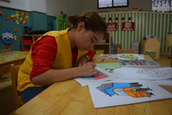 本次活动主要是教小孩子画画,陪小孩子做手工,陪小孩子参加,陪小孩子玩耍,9名志愿者随机分成三组,分别走进不同年级的不同班。