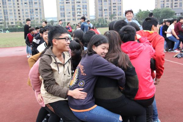 接下去是有意思的玩游戏时间,这个游戏考验的是各成员之间的默契以及耐力。规则是这样的:大家先围成一个圈,然后一个人坐到另一个人的腿上,看哪个组坚持的久。总共分为5组进行比赛,一开始每组都坚持着,随着时间一分一秒的推移,最后只剩下两组还在坚持着,两组成员都不想轻易放弃,一直鼓励自己的队友。最终还是由微信媒体部和马研会组成的成员获得了胜利,但各组的坚持不懈的精神还是值得我们学习的。