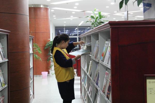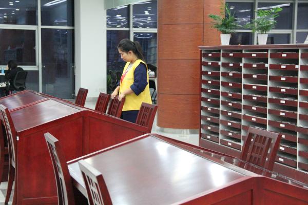 志愿者们的主要工作是阅读者管理、书籍归位、以及图书馆卫生清扫等。旨在为大家营造一个安静、舒适的阅读环境,共同打造和谐书香世界。图书馆是与城市的浮华喧嚣与众不同的充盈着书香的世界,志愿者们在这里整理图书,规范读者秩序的同时也感受到图书馆的浓厚文化氛围。为了给同学们留出更多的空位,她们将乱七八糟的椅子整齐地放置在桌子下面;为了让图书能够尽快的让同学们传阅,她们及时将书籍上架归位;为了让同学们有一个良好的阅读环境,她们仔细地将书架擦得一尘不染……在短短三个小时的志愿活动中,志愿者们始终坚守在自己的岗位上,从第一排书架到最后一排书架,一遍又一遍,一丝不苟地工作着。她们踏踏实实的实践着,从她们的精神中,我们看出了:志愿者在行动!
