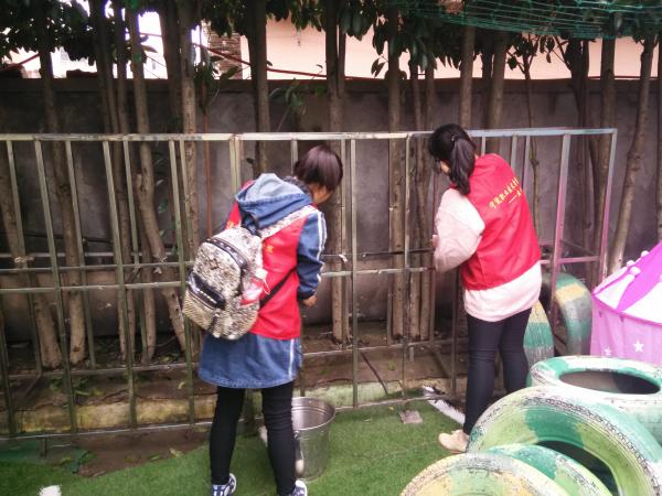 因为已是下午,幼儿园的小朋友们正在午睡,整个校园也十分安静。志愿者们在老师的带领下,各自被分配了任务。三位志愿者被安排了擦不锈钢架子的任务,还有两人负责擦花盆,其他的人则被分配去给教室的墙贴花。志愿者们在劳动的过程中非常认真,各自都很有耐心地做着自己的任务。下午两点三十分左右,铃声响了,小朋友们的午睡时间结束了,志愿者们也完成了之前老师分配的任务。他们为小朋友们穿好衣服,为女孩子们扎辫子,并且给小朋友们讲了好多故事。小朋友们和志愿者们相处得很快乐,整个与小朋友们互动的过程中都能听到大家的欢笑声。