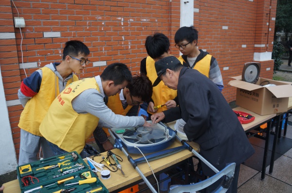 由于是周末的早晨,凤凰社区的大部分居民们在家休息,于是,志愿者们提出兵分两路,一队人在家电维修站点等待需要帮助的居民,另一队人则进入到社区内部向路过的人宣传家电维修活动。经过志愿者们的宣传,免费家电维修站点前很快涌现了大量需要维修家电的居民,严晓军同学和陈炎聪同学为各位居民们耐心讲解电器故障以及在今后使用中需要避免的操作方法。在场的各位居民都纷纷称赞,对维修同学进行表扬。