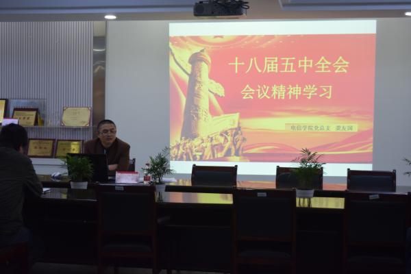 为了深入学习贯彻党的十八届五中全会精神,紧跟时代步伐,进一步推动学院各项工作的开展,11月24日12点30分,电信学院在党员之家开展“党的十八届五中全会精神学习”会议活动,会议由电信学院党总支书记龚友国老师主持并主讲,常务副院长张岐老师,副院长汪志达老师,及电信学院全体教师党员和在校生党员参加了此次会议。