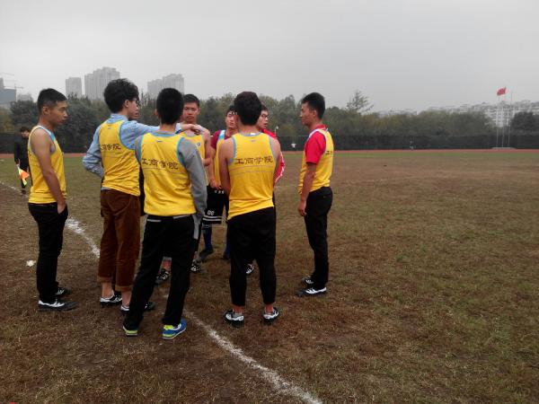 图为:我分院队员正在商量策略 上半场结束后,电信学院以3比0的比分领先。稍作休息后,精彩的下半场球赛开始,拉拉队们纷纷为自己支持的队伍呐喊助威。双方队员你争我抢,几个精彩的射门赢得场外观众的喝彩。最终电信学院以11比2的比分获得了此次比赛的胜利。虽然我分院战败,但大家都秉着“友谊第一,比赛第二”的原则,赛出了风格,赛出了水平。感谢今天在场上奋力奔跑的球员们,分院为你们感到骄傲。
