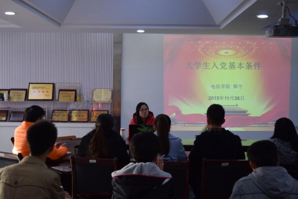 为更好的帮助入党积极分子端正入党动机,提高党性修养。2015年11月26日15点整,电信学院在敬业楼党员之家开展第二次入党积极分子党课培训。本次党课主题是“大学生入党的基本条件”,由电信学院团委书记陈宇老师主讲,电信学院入党积极分子参加了此次党课。
