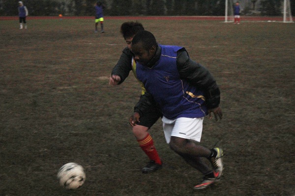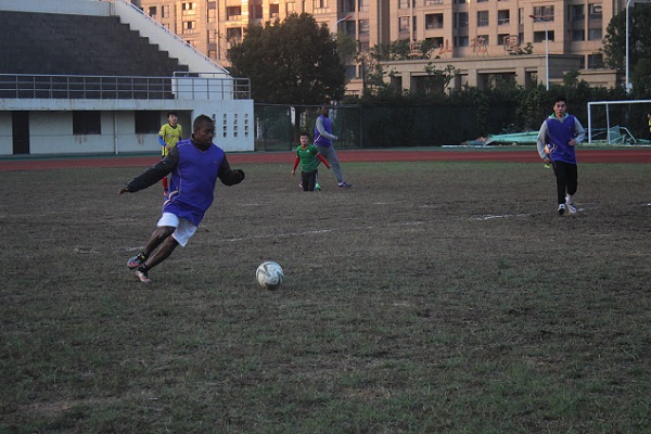 比赛前,球员们紧张有序地进行热身准备。随着一声哨响,足球赛正式开踢。对方队伍因了解到国际学院有体能较高的外国球员,比赛起初用拖延战术进行,然而由于我院球员一直保持强势进攻,屡次将球逼近对方球门,在上半场结束前十分钟,15号球员Jsufu成功射入首球!与寒冷的天气相反的场外的拉拉队们的欢呼热闹氛围中,更具期待的下半场开始,开场不久,球技精湛的13号球员Sun连进两球,国际球员不断拉开与对方的比分,以压迫式防守,终以5:1的优秀成绩取得本次比赛的胜利。