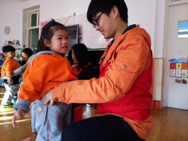 图为:志愿者给小朋友穿衣服