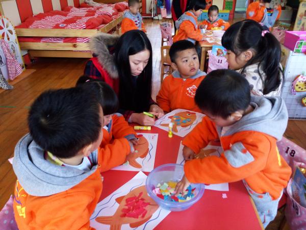 图为:志愿者和小朋友一起画画