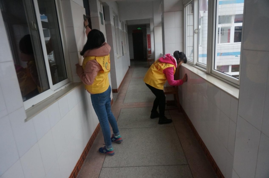 图为:志愿者在认真擦瓷砖