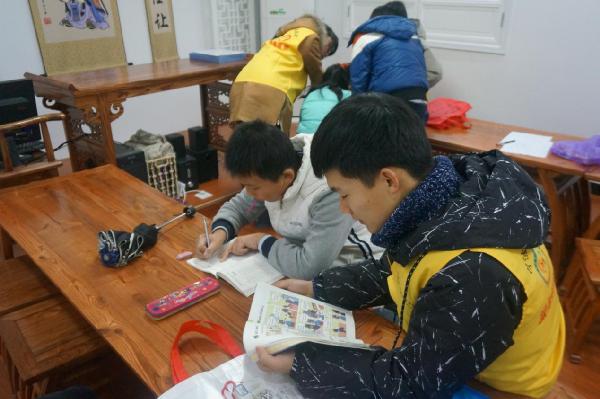 小朋友也早早的来到教室,准备开始一上午的学习。志愿者们积极帮助小朋友答疑解惑。在解答完后小朋友会笑着对志愿者说:“谢谢姐姐”。有的小朋友眉头紧锁独自思考,或三三两两的讨论,有的举手让志愿者来为之解答疑惑。教室里浓厚的学习氛围,仿佛可以抵御屋外的寒冷。