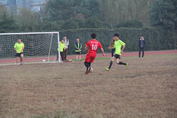 比赛于下午16:00准时开始。看,建工学院的足球健将身着火红的队服上场了。他们像火焰般穿梭在绿茵场上,用熟练的脚法和默契的配合,多次突破电信队的防线,短短时间内就进了第一个球。而电信学院也不甘落后,在上半场结束时,两队以2:2的成绩打成了平手。中场休息间,建工学院队进行了人员调配及战术调整。短短的休息时间结束后,两队又进入了下半场的激烈比拼。场上的运动员们激情澎湃,场边的拉拉队也激动万分——“建工加油!建工加油!”一声声鼓足了力气的呐喊声仿佛为建工学院的足球健儿们插上了翅膀,使他们越战越勇。两个学院的运动员们就像在草原上的一批批脱缰的“黑马”,不断地奔跑,为自己所在的学院而努力。随着时间一分一秒的流逝,比赛也接近了尾声。最后,两队以3:3的比分结束了此次比赛。