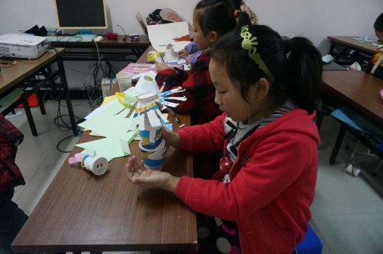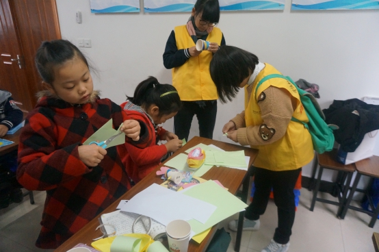 小朋友们一早便坐在教室里,看到志愿者们来了,都纷纷露出欣喜的表情,亲切地叫着姐姐,热情地欢迎志愿者们的到来。在完成作业后,在志愿者们的带领下,小朋友开始了手工制作。小朋友们认真地向志愿者们学习,将手中的纸,折成了乌篷船、小星星、千纸鹤、飞机等,还用一次性纸杯做出了小鱼、小娃娃。第一次没做好,就重新再做一次,还在上面加上船夫,涂上颜色,直到把手中的小船做的美美的,才满意。看着自己亲手完成的作品,小朋友们特别自豪,脸上洋溢着灿烂的笑容。
