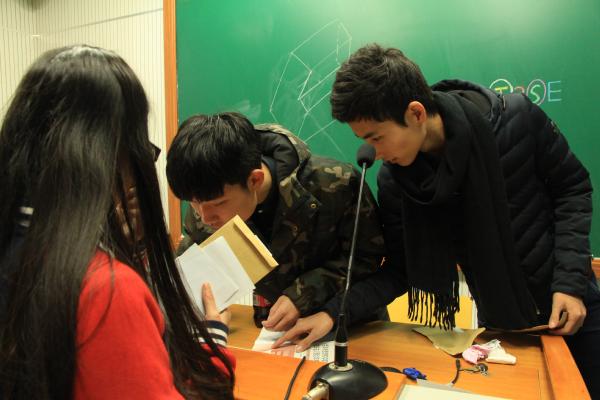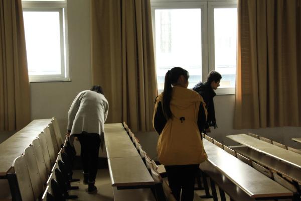 首先,文娱部部长叶超同学在教室里讲明了游戏规则,其中有四个黑衣人,被黑衣人抓到要回到上一层楼进行惩罚。从五楼开始解密,依次下一层楼,共得通过5个关卡,才能拿到终极大奖,当然,比赛成员之间也能联盟。第一关,在2503教室,成员们被告知要找线索获得密码才能通关进入四楼。陈振杰、竺孟杰等同学找到线索后围在一团破解密码,另外的同学也在想办法找线索,一想到可能的密码就出门试,来来回回,密码对了还要玩游戏,使放在书本上的硬币翻面才算通过,这一关所有人都通过用了一个多小时的时间。后面各层楼的解密都很精彩,喝饮料、转圈、石头剪刀布、黑衣人以及线索被毁等等的“意外”,到了最后关卡,所有人有了五张带有数字的纸条,要猜出最终的地点。最终,陈振杰与池梦婷首先找到了最终地点--四号楼前台,然后金国俊也随后到达。这三名同学获得了最终大奖。