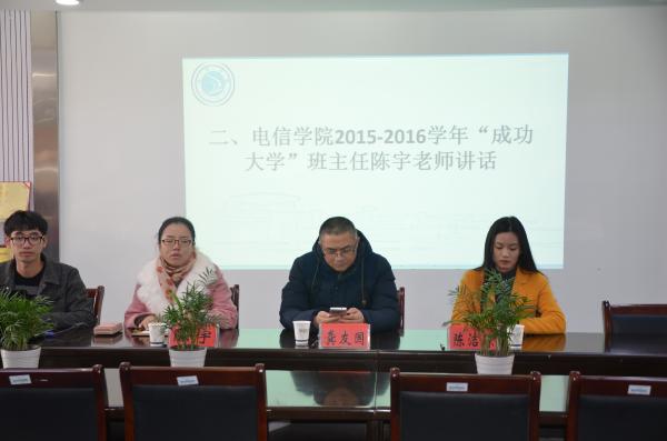 2015年12月17日下午13点30分,电信学院在敬业楼党员之家举行了“成功大学”开班仪式暨成功大学优秀学员结业典礼。出席本次仪式的有电信学院党总支书记龚友国老师,电信学院团委书记陈宇老师,电信学院辅导员陈洁琼老师。仪式由团委学生会主席团助理谢柏通主持。本届“成功大学”由陈宇老师担任班主任。
