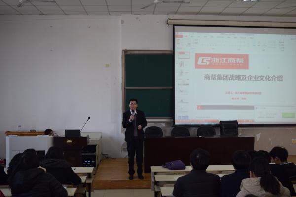 镜头切换,浙江商帮集团市场总监陈小华首先播放了一段景德镇短视频开场与同学们积极互动再切入正题由企业文化宣传片为我们更加直观的介绍了浙江商帮集团,首先是公司简介,创于2007的浙江商帮科技现已在全国设立了18家直属分支机构,公司员工总数逾2000人,其次介绍了公司的各项荣誉以及员工风采等,他表示商帮需要更多的年轻血液,商帮愿意提供给同学们机会,希望同学们积极争取。