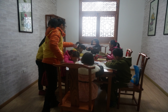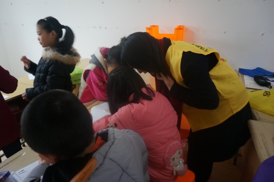 图为:志愿者教小朋友作业