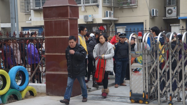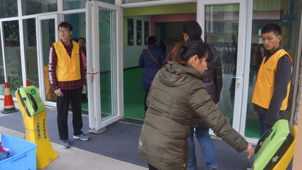 临近放学的时间,大门外的家长越来越多。两位值守大门的同学按照事先计划,一位负责指挥家长安全的停靠车辆,另一位则维持家长们排队的秩序。当放学铃声响起时,家长们陆续进入幼儿园内排队刷卡,接送自己的孩子。场面显的井然有序。