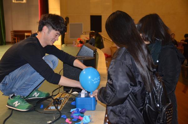 晚会当天早上,就可以看到忙碌着的电信学院学生会干事。搬椅子的,搬话筒的,还有放音乐,调节音质。中午,他们吃完自己叫的外卖盒饭又继续对现场进行布置。工作人员们都积极完成自己的任务,没有一个人懈怠、偷懒。他们互相帮助,积极参与。“这个怎么弄?”“等下,我来”“这边来人布置下”“好,马上来”。现场在这充满紧张的氛围下有条有序的变得愈发漂亮趋向完美。