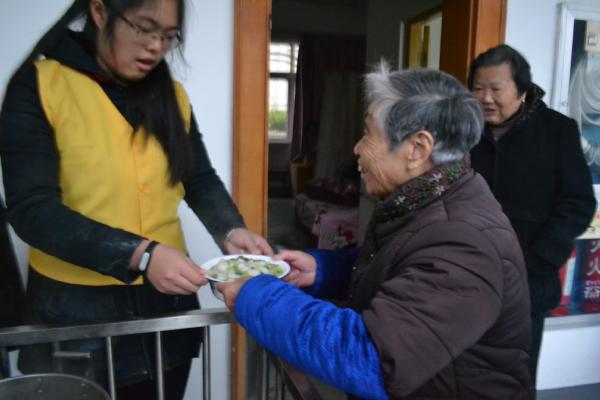 图为:志愿者为老人端上圆子 时间过得很快,晚餐准备好后,志愿者们主动到敬老院的每一位老人的房间分配晚餐,老人们对晚餐很满意,大家都吃的很满足。最后志愿者们也对自己动手准备的晚餐进行了品尝。整个敬老院里萦绕着爱的暖流,场面温馨感人,老人们脸上洋溢着幸福的笑容。
