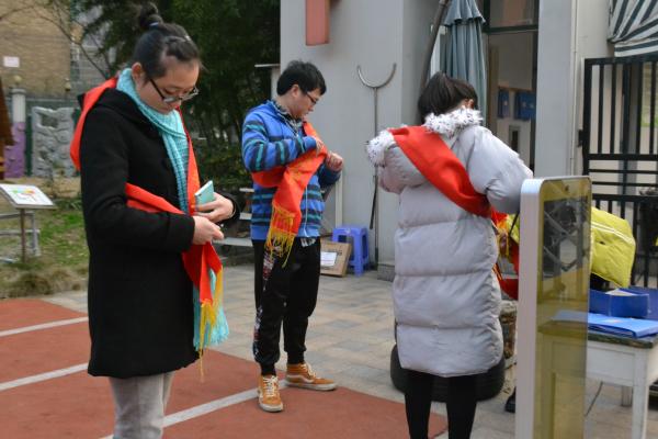 图为:志愿者们正在准备 31日下午三点五十分左右,志愿者们来到了新蕾幼儿园,此时距离孩子们放学还有几分钟的时间,志愿者们在校门口佩戴好发的红领带,并且站成两排等候着。他们的任务便是向这些放学的孩子说再见与新年好。 伴随着放学铃声的响起,家长们陆续进入学校接孩子回家。“小朋友再见”“新年好”志愿者们对着放学回家的孩子及家长说着,并挥手示意着。小朋友活泼地嬉笑着挥着手说着再见,家长们也热情回应,校园里充满了欢笑声。