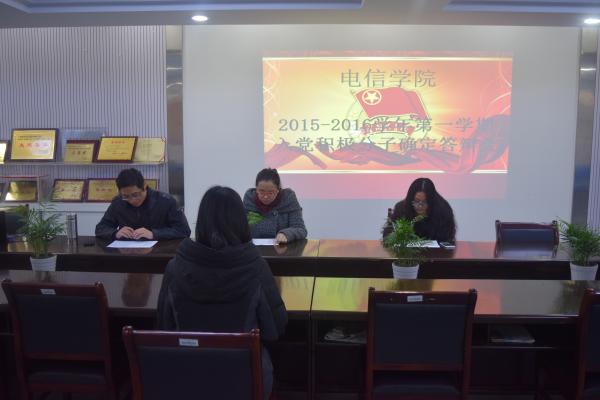 为了更加的了解入党积极分子对党的态度,对党的了解。电信学院在2016年1月12日中午12点整在敬业楼二楼党员之家开展了电信学院2015—2016年第一学期入党积极分子确定答辩会。答辩评委由我院团委书记陈宇老师,辅导员刘利峰老师和陈洁琼老师担任。