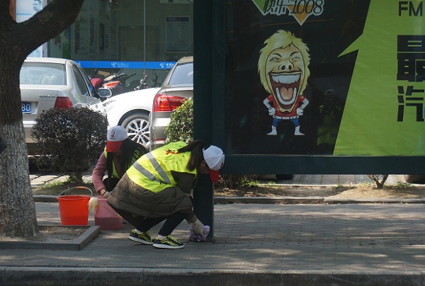 而第二组志愿者与社区工作人员则提着水桶和拿抹布对社区内和千丈站旁的公共自行车点进行擦拭,原本堆着厚厚灰尘的公共自行车点被擦拭得一尘不染。最后一组志愿者来到路边擦拭公交车站站牌和站台。在等车的市民纷纷表示赞许和支持。