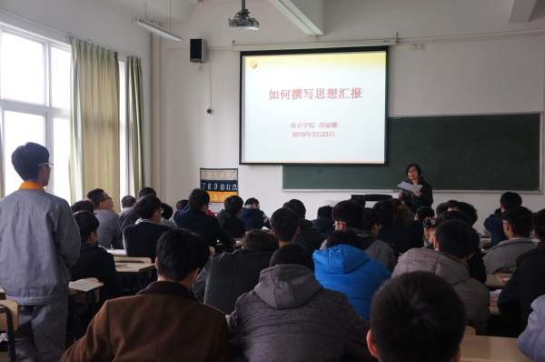 本次课题分为“体现主要内容”、“注意事项”、“书写格式”以及“欣赏范文”四大部分。胡老师重点指出写思想报告要切记空话、套话、假话、做表面文章,作为入党积极分子一定要实事求是,对自己做一分二的评价,不但要对自己的成长进步进行肯定,而且要找准存在的不足,敢于向党组织暴露缺点和问题。希望入党积极分子们能不断学习,向党靠近,早日成为一名优秀的共产党员。
