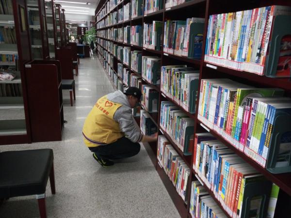 图为:志愿者正在整理书架