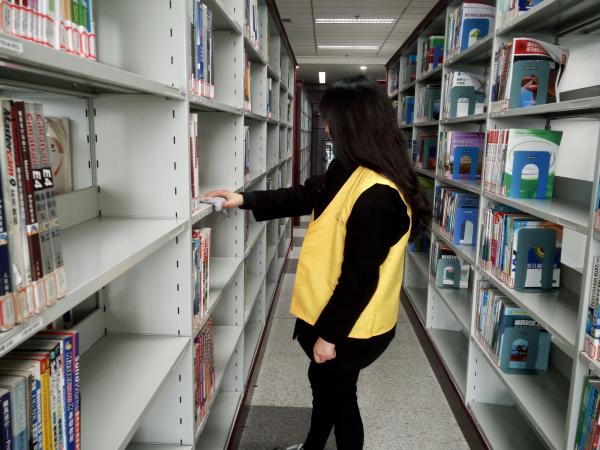 到达了图书馆的三楼,带队人简单地说明了图书馆志愿者们主要是打扫一下图书馆的卫生,用抹布擦拭每一个书架和桌椅,在打扫完成之后,将书架上每一层的书都整理整齐,旨在为大家营造一个干净、舒适的阅读环境,共同打造和谐“书香”世界。