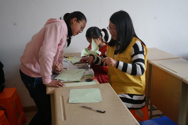 图为:志愿者在教小朋友做风车