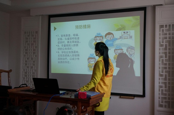 社区的小朋友们早早地便在教室里做作业,当遇到不懂得问题时,就立刻向志愿者们求助,志愿者们则仔细耐心地教他们,尽自己最大的努力帮他们辅导功课。第二节课,志愿者先教小朋友们做风车,采取一对二模式,一步一步详细地步骤教学。小朋友们围着志愿者,全神贯注地看着,生怕错漏了某个环节。很快,小朋友们就学会了,还说一定要自己亲手做一个风车出来。经过一段时间的仔细琢磨后,许多小朋友都在试转自己亲手做的风车,看着手中的风车不停地旋转,他们的脸上洋溢着灿烂的笑容。最后的半个小时,志愿者给小朋友们讲了关于春季流行感冒的预防知识。让小朋友们正确认识流感,并学会保护自己,养成良好的卫生和生活习惯。