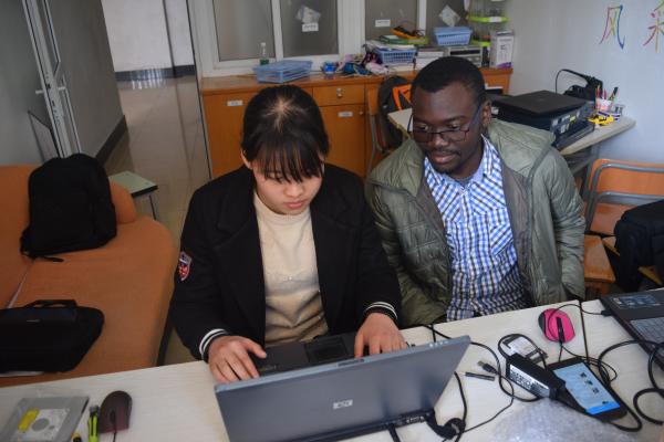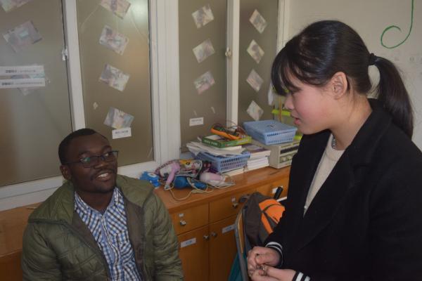电信学院的“爱心维修站”专为全校师生解决计算机、手机系统软硬件和小家电方面遇到的各种疑难问题。主要提供计算机优化,系统重装,手机刷机,小家电维修等服务,且不收取任何费用。为对科协的成员们有更深入的认识,我院新闻采访小组来到大学生科技协会维修站了解情况。3月29日上午9点,科技协会会长助理李诗怡便早早在工作室工作。图为:科协助理李诗怡与国际友人交流中