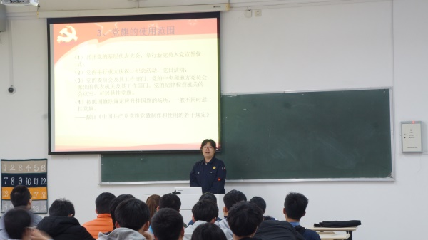 2016年3月31日12时40分,于5518教室,来自教工第一支部的王劲老师为全体入党积极分子上党课,课名为“党旗”。 中国共产党的党旗,是中国共产党的象征和标志。红色党旗上的唯一图案标识,是金黄色的党徽。红色代表革命,黄色象征光明,锤子、镰刀代表着工人阶级和广大人民群众的根本利益。