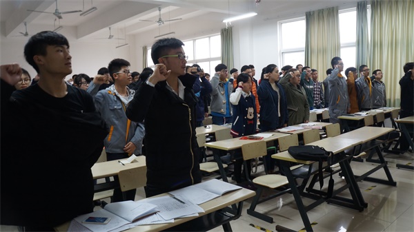 图为:党课现场 历史表明,中国共产党的旗徽标识不是在成立时就有的,是随着革命斗争的发展和需要,逐步形成和确定的。最后,王老师带领着在场的各位,全体起立,重温入党的誓词,在神圣的党旗前结束了本次课程学习。海天学院宣信中心 何昕颖/文 徐信道/摄