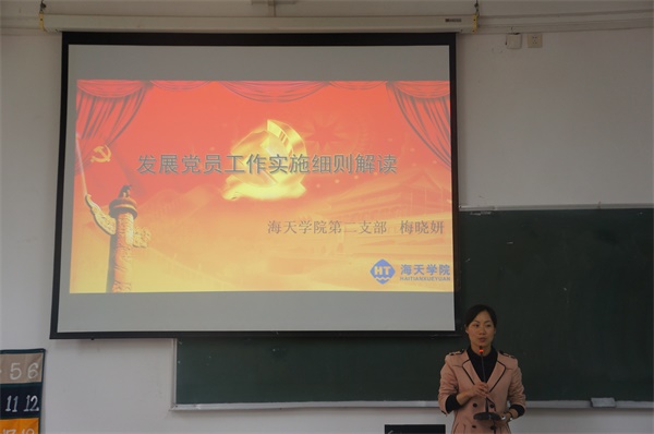 2016年4月6日12时30分,来自教工第二支部的梅晓妍老师于海天楼518教室为全体入党积极分子上党课,课名为“发展党员工作细则解读”。 授课一开始,梅老师解释了为什么入党分子要集体授课。应文件要求,学生入党积极分子发展成预备党员必须取得24个小时的理论学时,每次课程长达20到30分钟,因此,海天分院安排了16次授课。