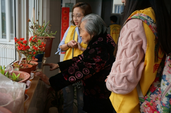 两周一次的活动,虽然每次的志愿者不同,但黄色马甲已给老人留下了深深印象。天气渐渐变暖,志愿者们如一阵春风,吹进老人的心。阳光洒满阳台,老人们坐在椅子上,打扫完卫生的志愿者们和老人坐在一起聊天。虽然不能很好的沟通,但这样的气氛已十分温暖。春天来了,院子里的花开得很美,窗台上的小植物也暴发着顽强的生命力。一位老人和志愿者们一起站在窗台前赏花,就如同一家人,谈笑着,在这个春日。