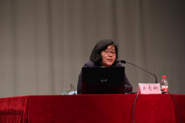 图为:王青柳老师演讲中